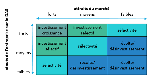 On prend en compte la compétitivité en abscisse et l’attractivité en ordonné. On priorise l’allocation de ressources. Plus de critères sont pris en compte, on prend les critères des 5 forces de Porter. Pour chaque DAS on prend tous les critères, on regarde comment on se positionne. On peut noter pour chaque DAS. On compare chaque DAS à l’attractivité et la compétitivité absolue de l’industrie.