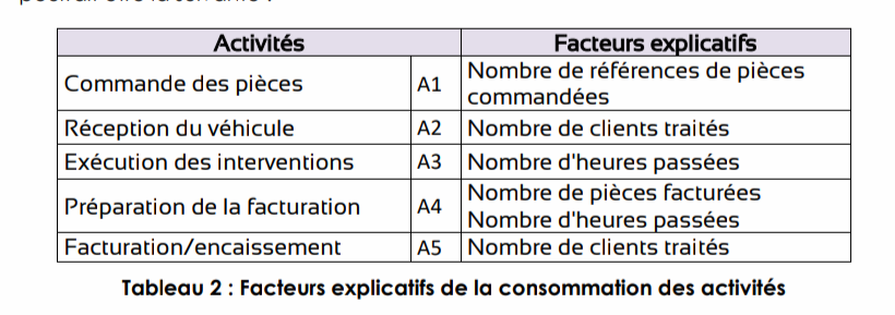 Dans le cas de notre processus « réparation », la liste des facteurs explicatifs de la consommation des activités par notre objet de coût (i.e. la réparation d’un véhicule) pourrait être la suivante :